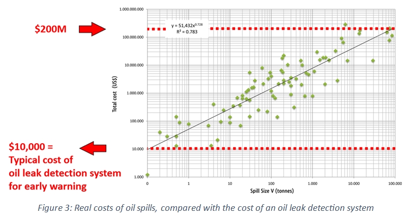 Figures in this real-world oil spill events well fit with the theoretical model. While comparing these costs with the typical cost of an oil leak detection system, as shown in figure 3, the economical benefit of the last becomes very clear.
